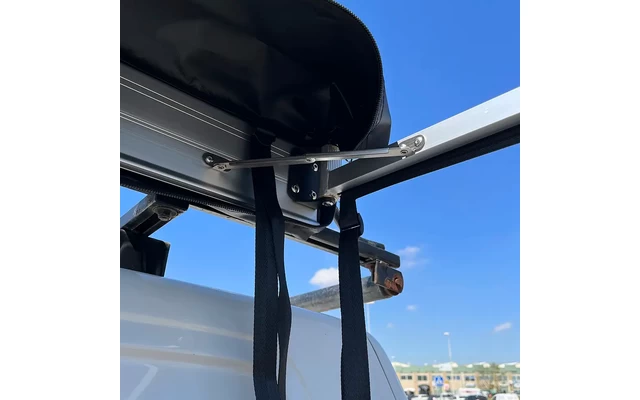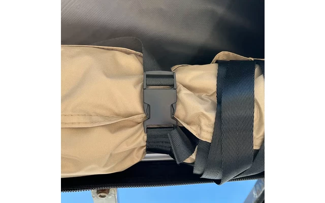 Sobald die Basis am Fahrzeug befestigt ist, kann die Höhe der Kabine mit Hilfe der Begrenzungsbänder (je nach Größe des Fahrzeugs) eingestellt werden, um zu verhindern, dass der Stoff unnötig am Boden reibt und schmutzig oder beschädigt wird.